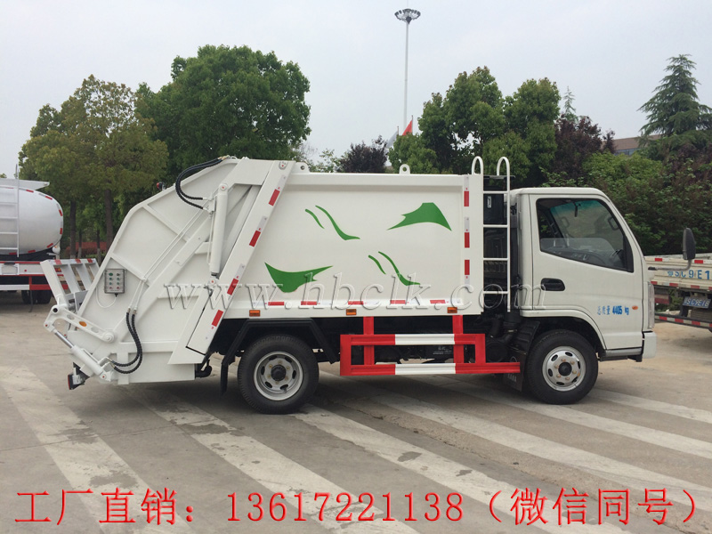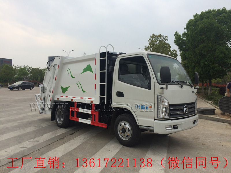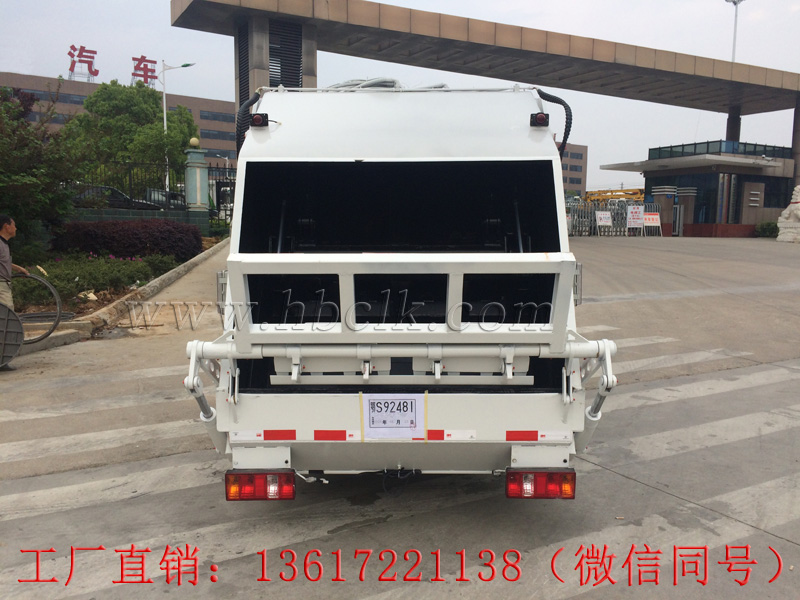 厢体材料为优质锰钢,厚度为边三底四,厢体容积:4立方米。由装料机构、压缩机构、卸料机构、油泵、油箱、阀等组成的液压机构组成。装料机构由支架、连杆机构、凸轮、挂钩等组成,在油缸作用下,将垃圾桶内的垃圾自动翻转倒入料斗内。