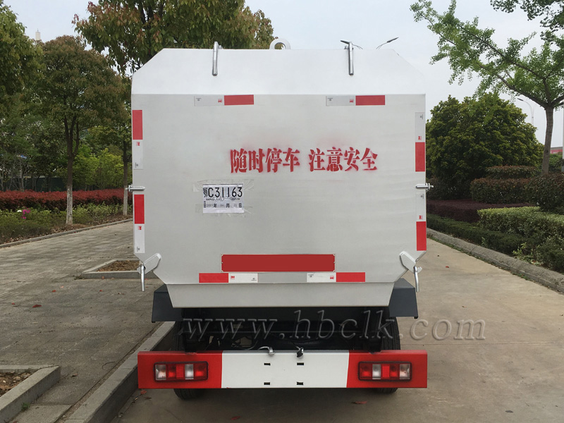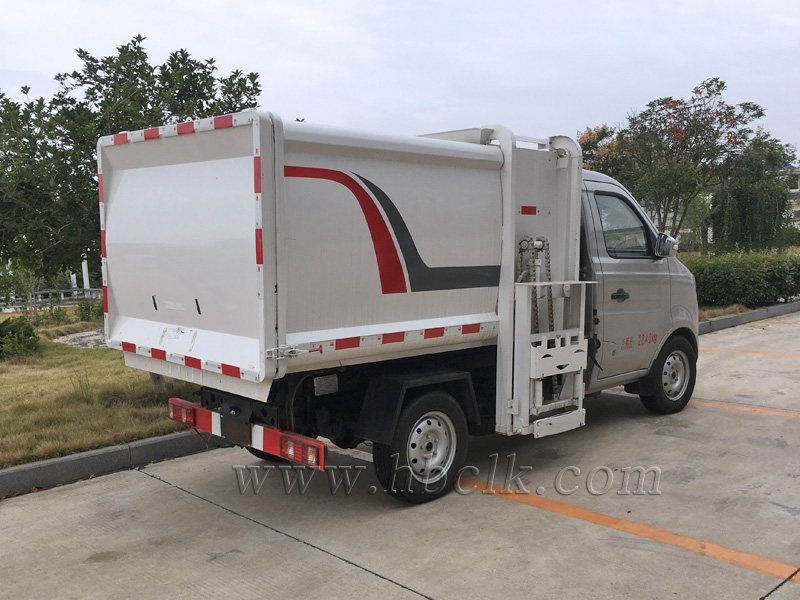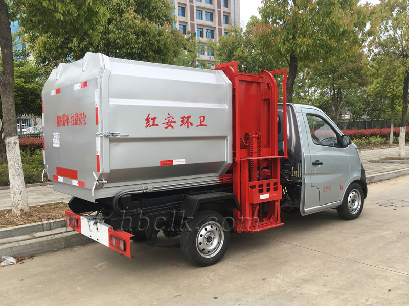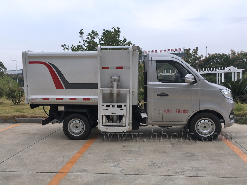 该车箱体有效容积3立方,箱体前部侧面带有挂桶提升机构,可自动举升垃圾桶倒入垃圾,带自卸功能,尾部装有橡胶密封条,防污水滴漏,杜绝二次污染。挂桶垃圾车可根据客户要求搭配120升或240升塑料桶和铁桶。