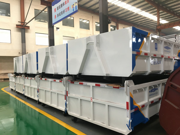 勾臂式垃圾箱又称车厢可卸式垃圾箱、可移动式垃圾箱、拉臂车垃圾箱、生活垃圾收集转运箱,与勾臂车(车厢可卸式垃圾车)配套使用,是目前国内市场上垃圾收集转运的主要盛装转运工具,应用广泛,循环使用方便,一车配套多个转运箱使用,效率高,造价低等优势受到广大环卫事业工作人员的大力推荐及使用。主要运输介质为:生活垃圾,密度约为0.6吨/立方米,主要利用底盘自带发动机为动力,通过变速箱上安装取力器带动油泵驱动液压油缸实现机械臂运作的勾臂车对垃圾箱的上钩、下卸、自卸等功能。