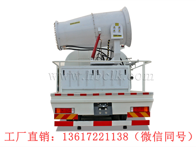后工作平台装配风送式远程喷雾机组,又称:雾炮,实际射雾距离:60-120米不等,配备的中置副发电机组,位于驾驶室与罐体之间。雾炮可手动或遥控操作,遥控距离100米。炮筒可左右旋转,上下持续摆动,以便进行全方位喷雾降尘、加湿、降温作业。