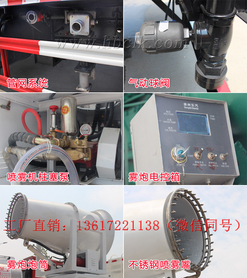 后工作平台装配风送式远程喷雾机组,又称:雾炮,实际射雾距离:30-80米不等,配备的中置副发电机组,位于驾驶室与罐体之间。雾炮可手动或遥控操作,遥控距离100米。炮筒可左右旋转,上下持续摆动,以便进行全方位喷雾降尘、加湿、降温作业。
