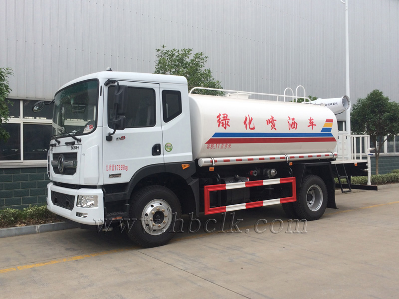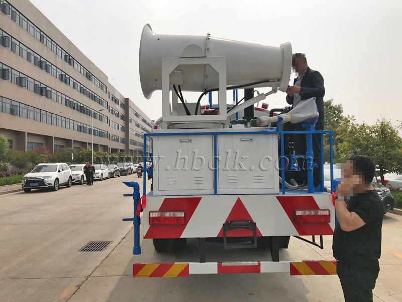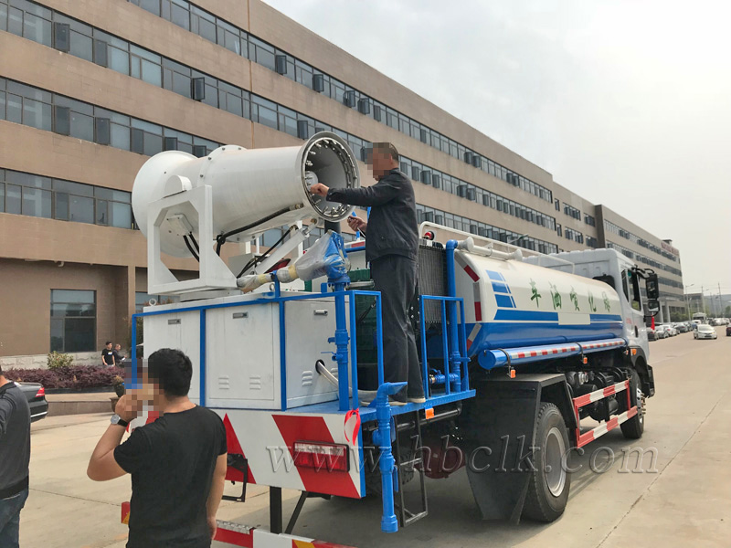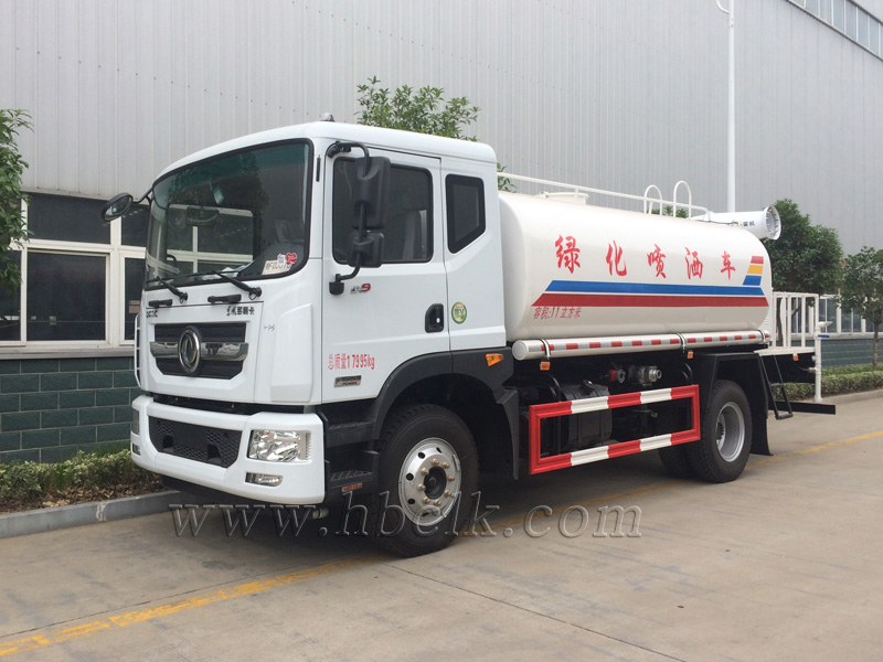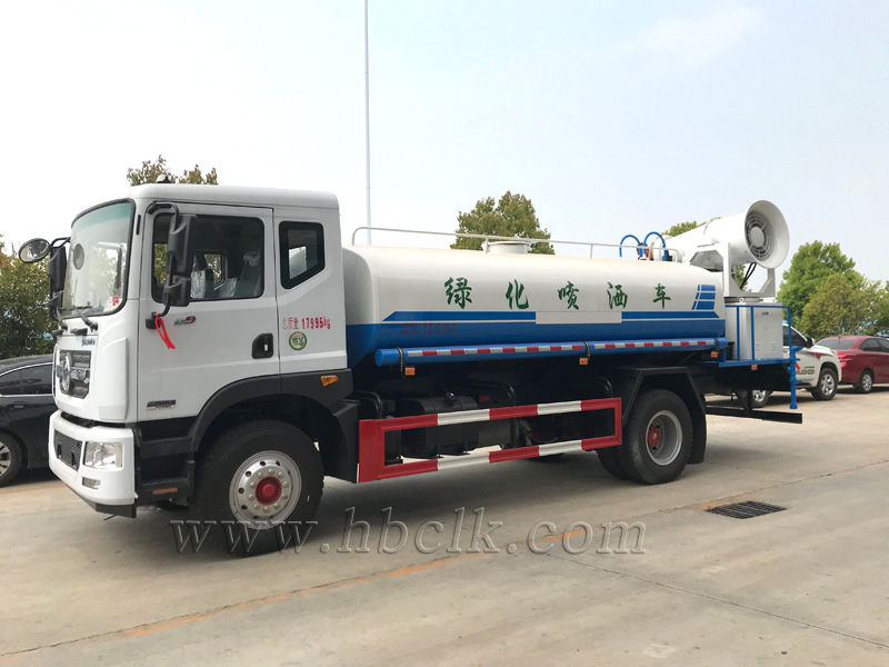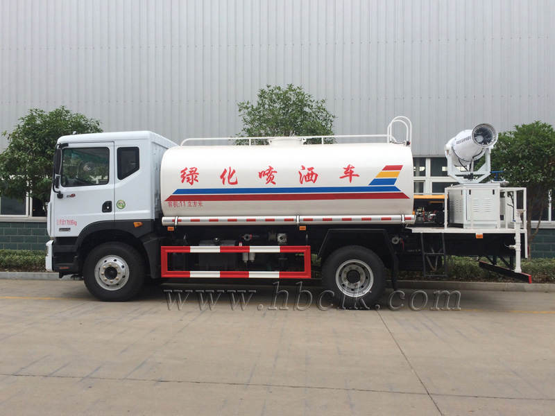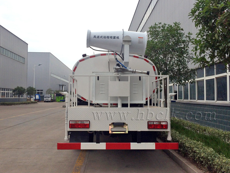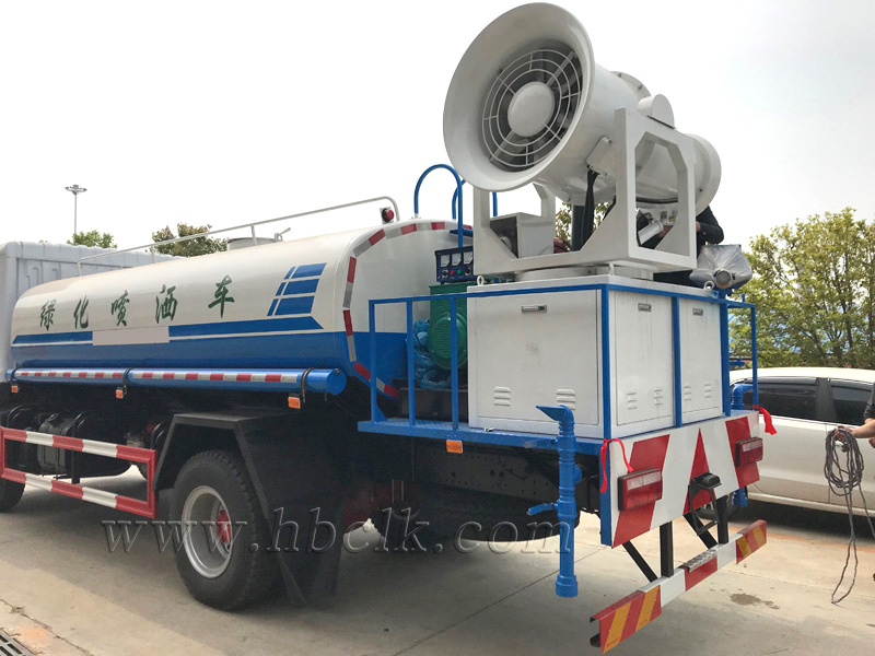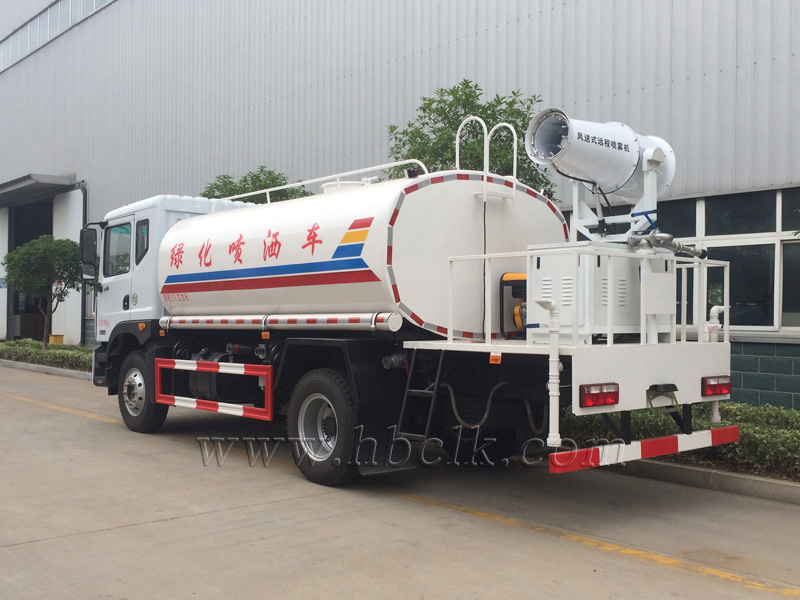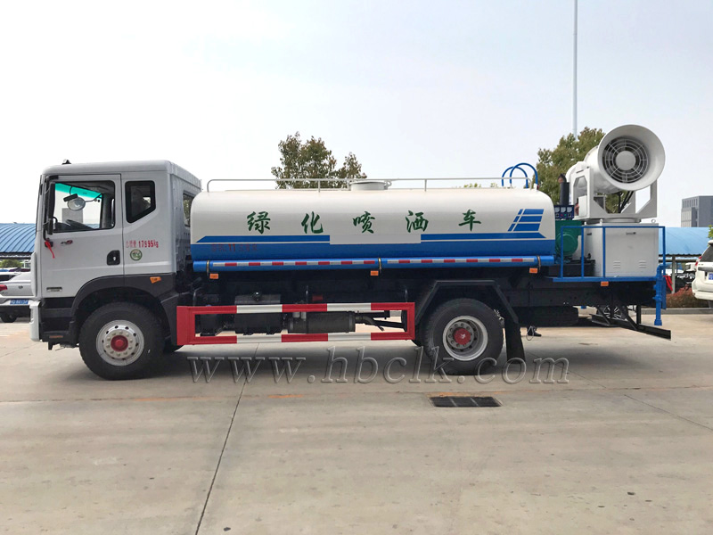 罐体实际容积为:10-13(标准)立方米,整车带前冲、后洒、侧喷喷头、远程高压水炮。平时可用于道路洒水、绿化浇水、喷洒农药、喷雾降尘,关键时刻高压水炮还可用于应急消防。罐体内部可按用户要求加做特殊耐酸、耐碱防腐处理,管道低点设置防冻装置,喷雾机组可手动操作或远程遥控操作。喷药雾炮可上下、及左右360度旋转喷药,一个即可操作全车。罐体前端仓内放置喷雾机配套的汽/柴油发电机,罐体两侧壁上均开有大量排气孔,方便散热,罐体后部工作平台上放置风送式远射程喷雾机。