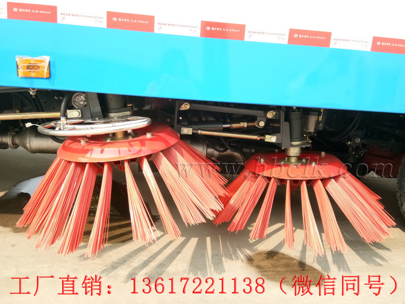 11、左右前刷盘可或联动:使车辆在工作中能够有选择地使用右前扫或左前扫工作,使得靠快车道一侧的工作机构可在选择左扫的情况下不伸出车体既减小了占道宽度,提高了作业和通行车辆的安全,又减少了扫刷的磨损,降低了运行成本。