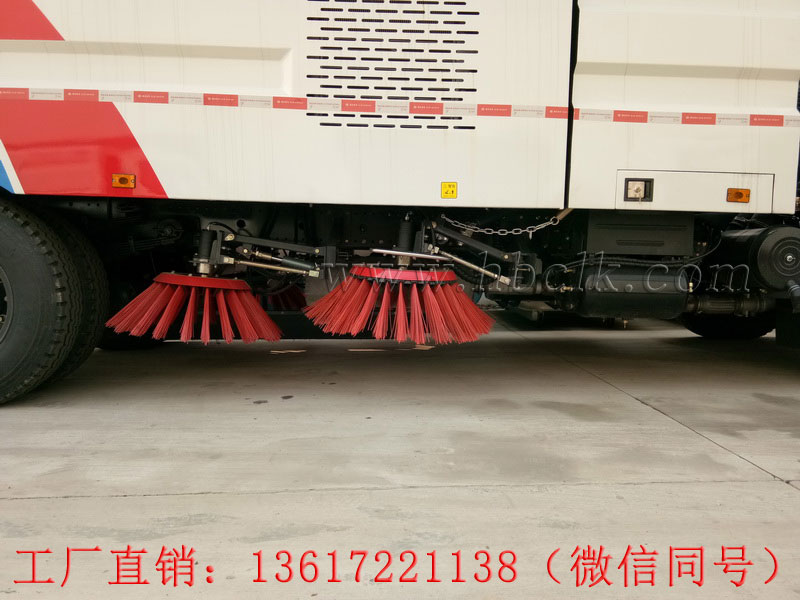 2)采用“中置两立扫+真空吸尘罩+中置宽吸嘴+左右四吸尘管”的布置方式。大扫刷设计,可清除道路台阶死角垃圾,吸嘴能随地面状况自动找平,清扫能力大,清扫速度快。
